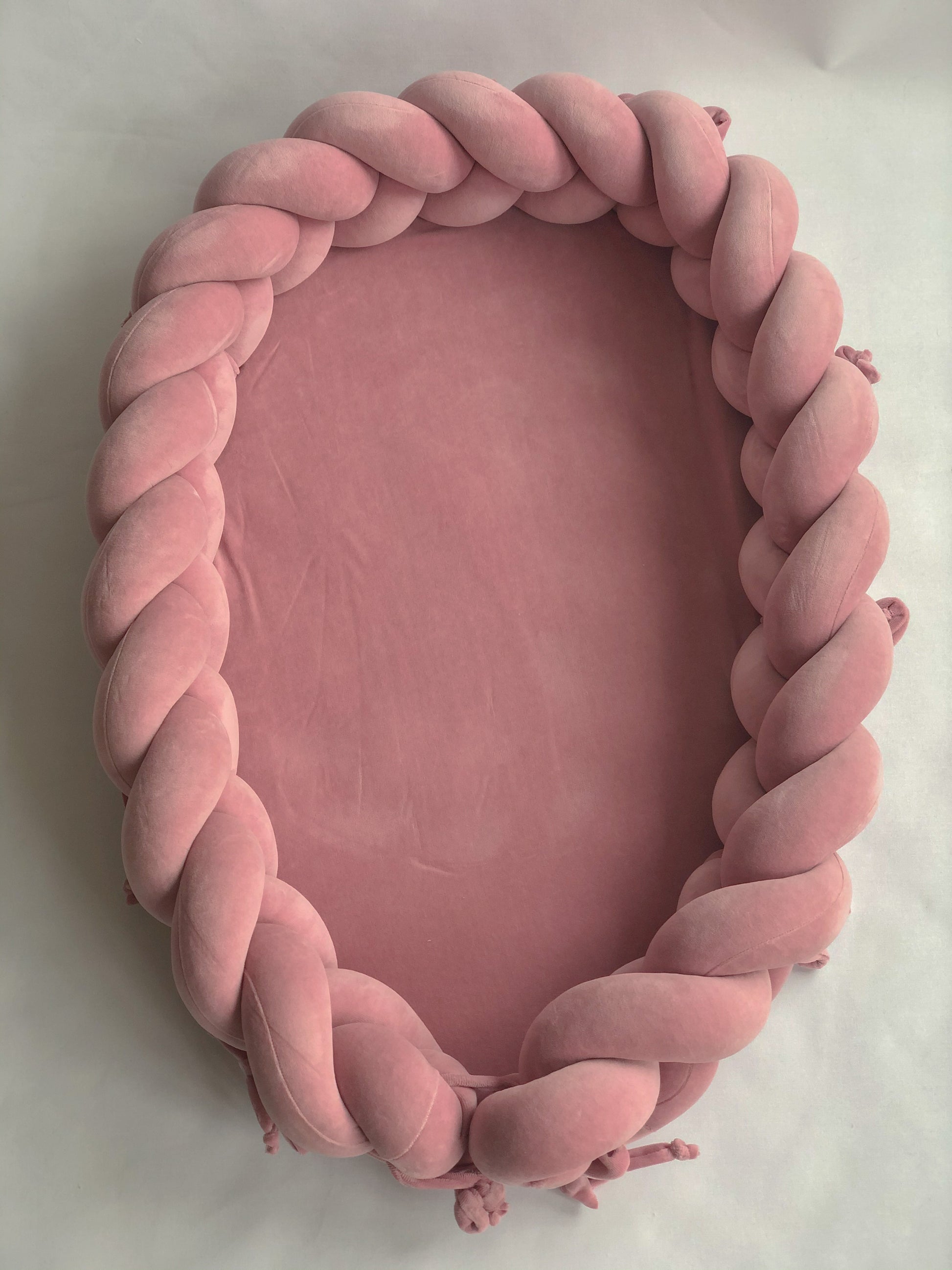 Babynest Tresse är vårt vackra handgjorda babynest där flätan är avtagbar. Går att beställa med eller utan stor handgjord rosett 🎀 i samma färg och tyg eller önskemål.