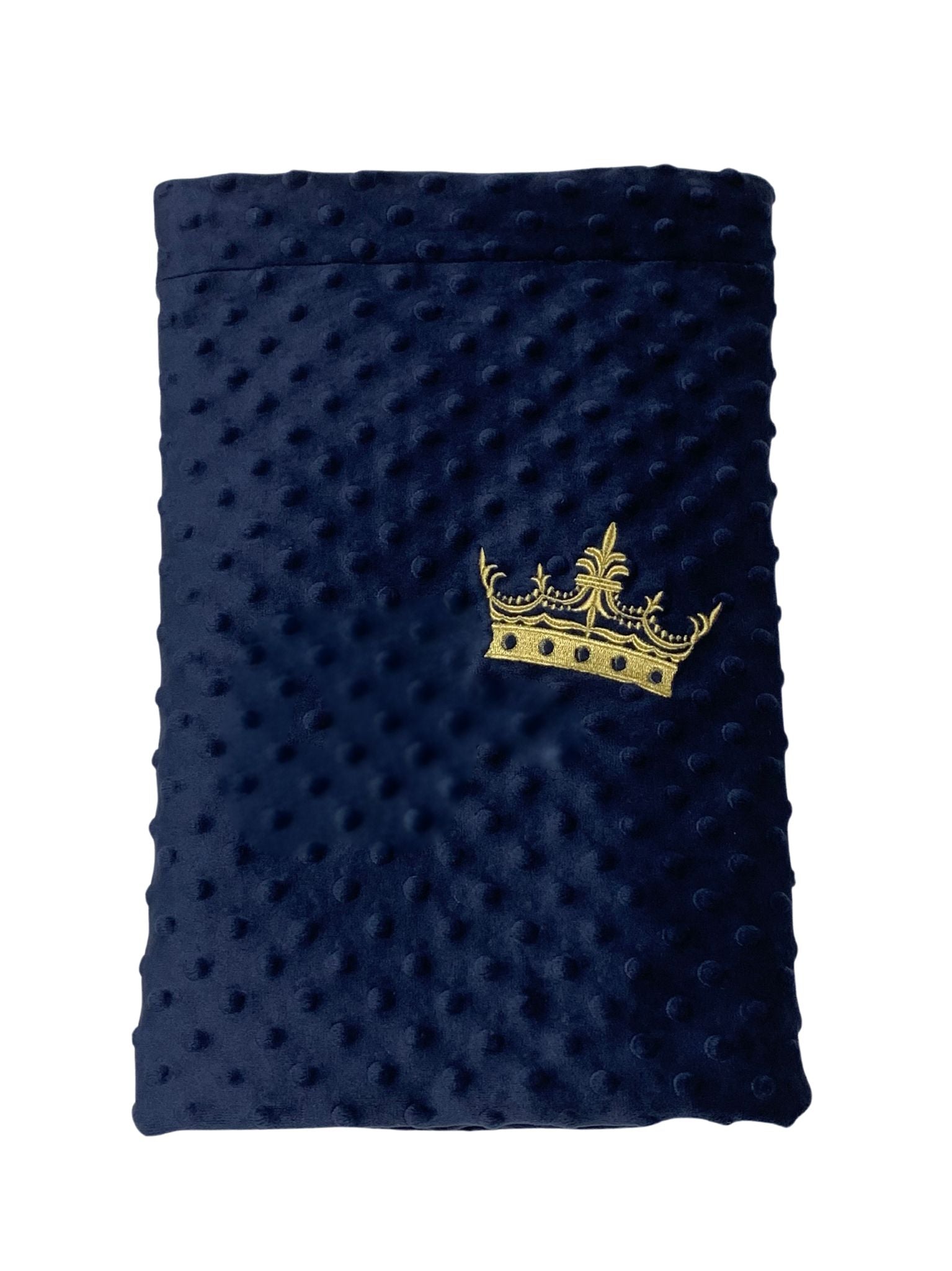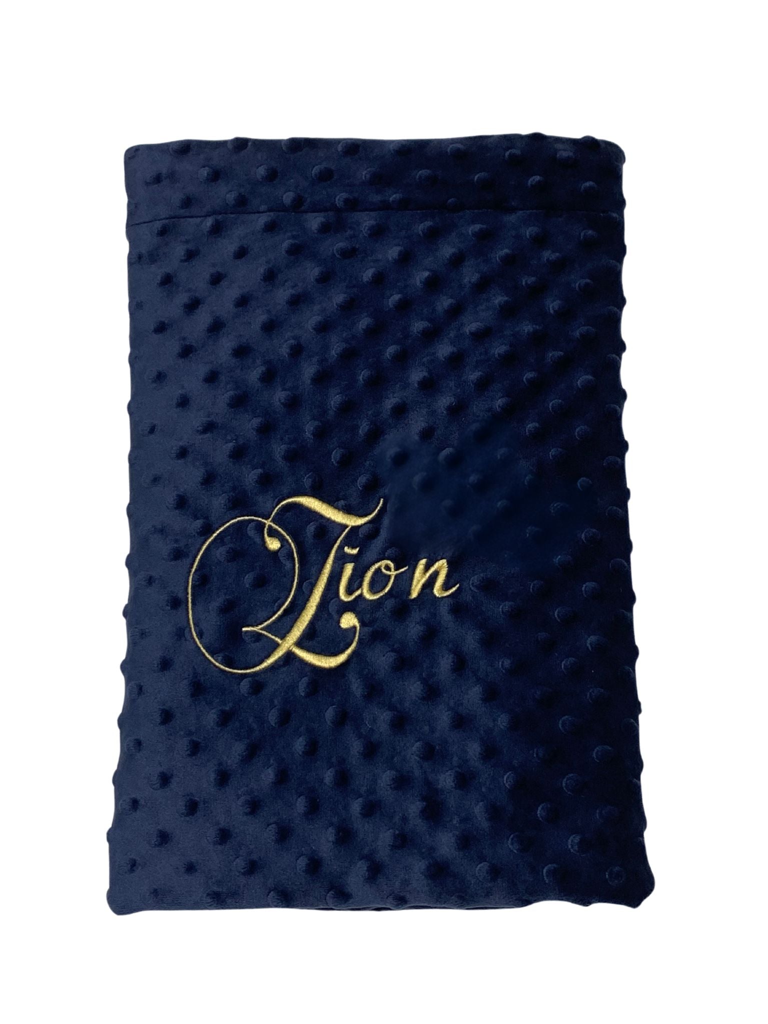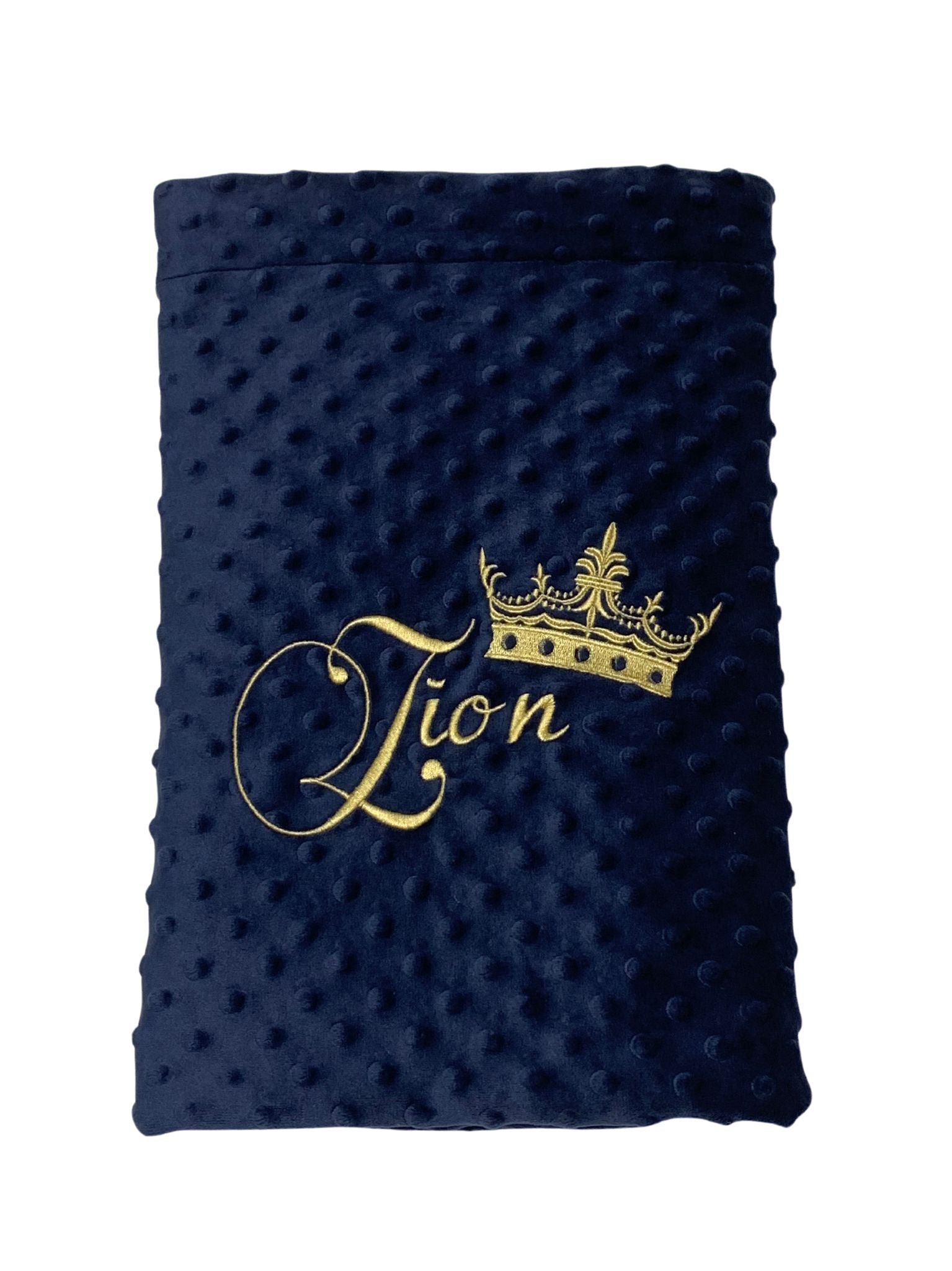 Obs! Bilderna på minky ploppar marinblå och guldbrodering är endast för att visa hur broderingen kan se ut.