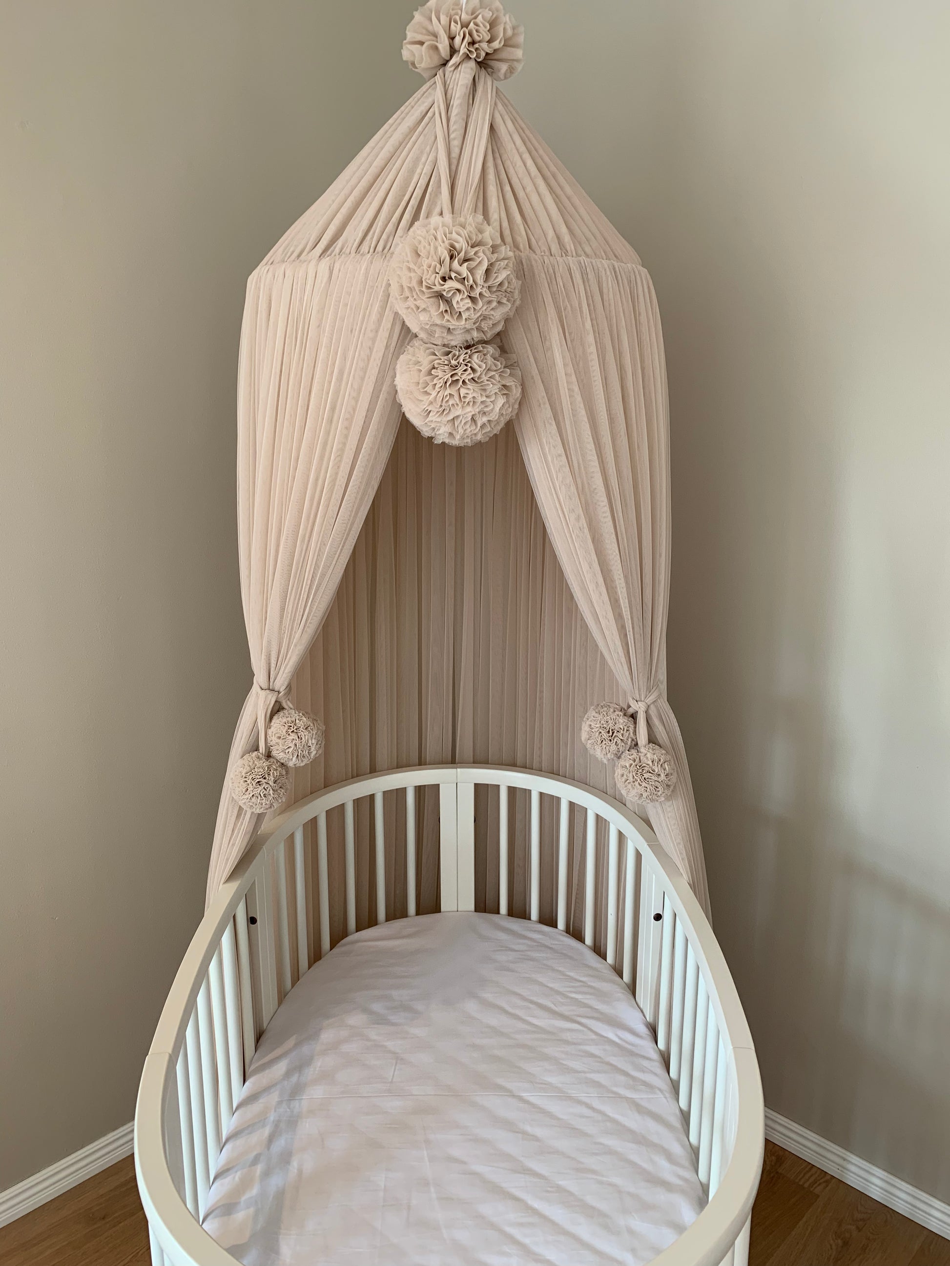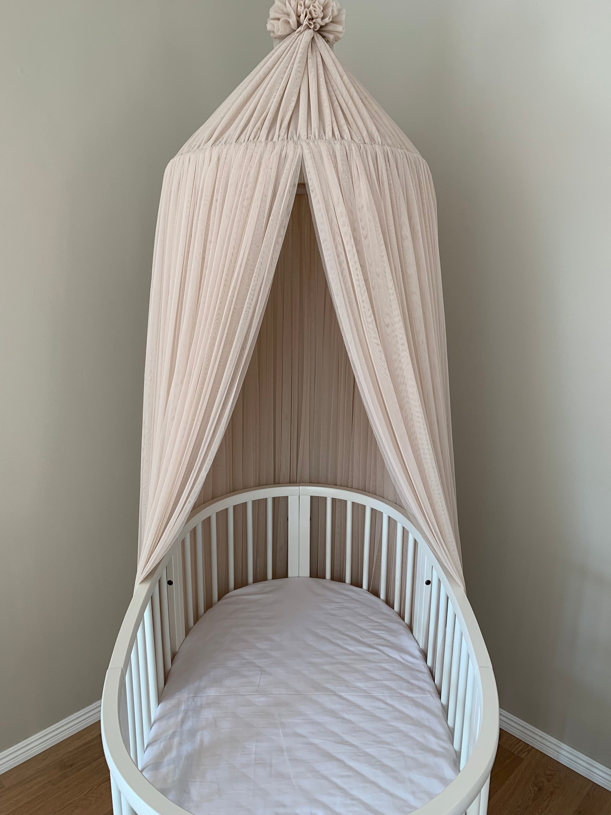 Sänghimmel Platinum är en stor och vacker sänghimmel som har lång användningstid, från spjälsäng till juniorsäng till vuxensängen om man så önskar, däremellan kan man även ha den i läshörnan eller myshörnan. Sänghimmeln levereras färdig att hänga upp i en krok i taket.