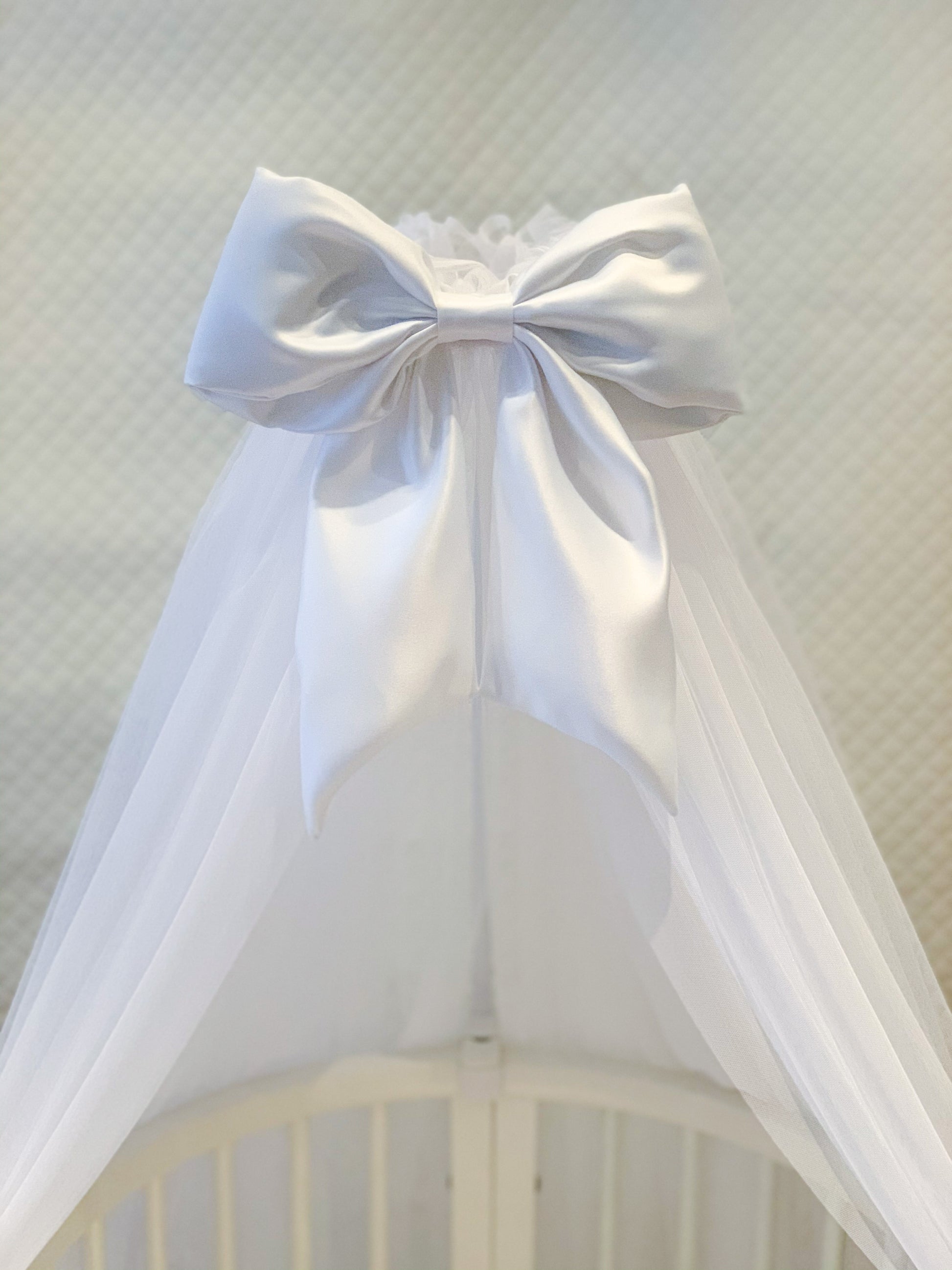 Vit SĂ€nghimmel med stor och lyxig handgjord rosett 🎀 i vit satin, rosetten Ă€r avtagbar.